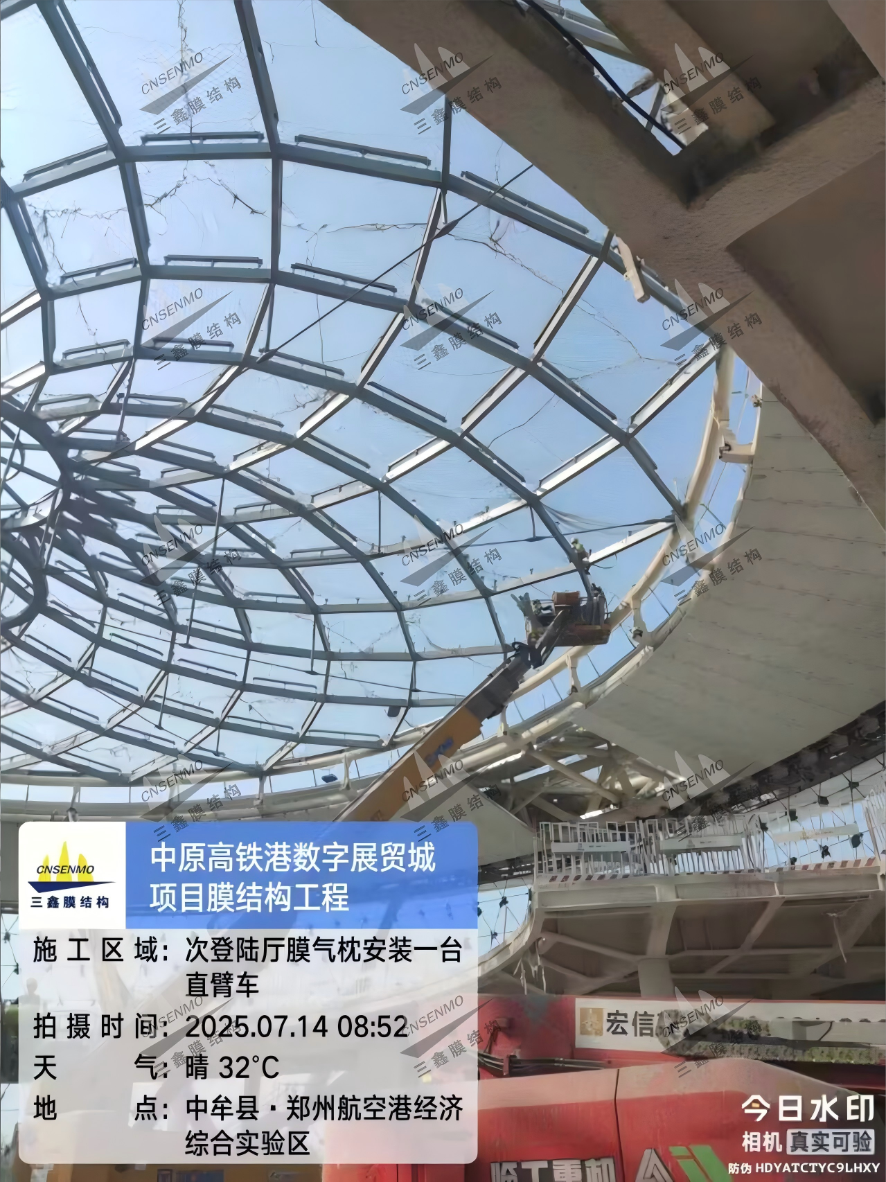 当前,项目已全面进入膜面展开与结构张拉冲刺阶段。作为2025年第三届全国职业技能大赛的举办地,中原高铁港数字展贸城肩负着2025年9月前投入使用的重大使命。 主拱索系完成,ETFE气枕膜已进场安装进行中,副拱型材、深水天沟与集水斗系统同步安装。云顶国际建设者与时间竞速,从索系统布线到不锈钢拱脚测量,每一环节精密推进,既是对“管理有度、施工有章”理念的践行,更是对如期交付、确保大赛顺利举办的庄严承诺。
