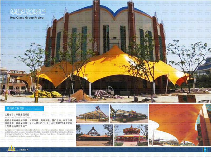 主要合作的项目有:安徽芜湖华强方特游乐中心、郑州华强方特游乐中心、南宁华强方特游乐中心、嘉峪关华强方特游乐中心、沈阳华强、济南华强、长沙华强方特中心、宁波华强方特中、厦门华强方特中心等等。总计完成的膜结构面积6万平方米以上。